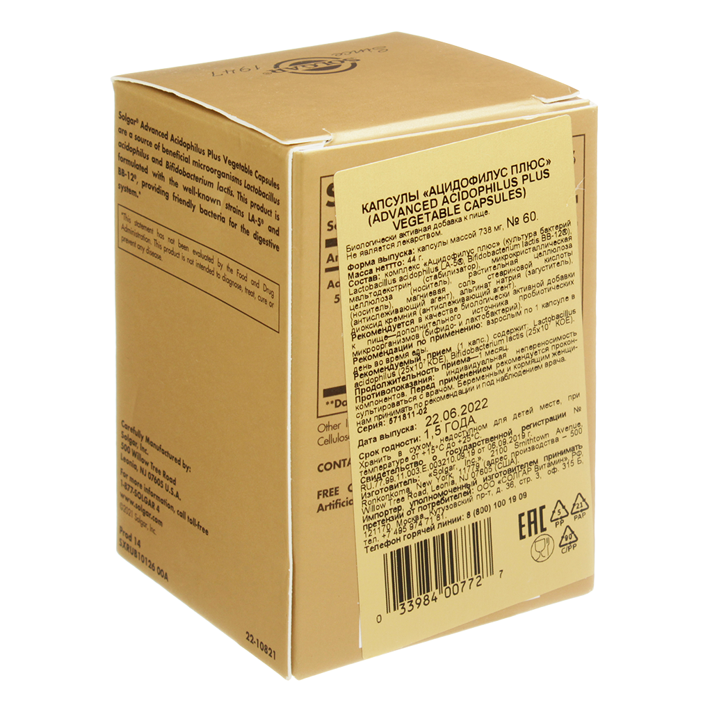 1 капсула содержит: Bifidobacterium lactis, BB-12® 1.25 x 10*8 КОЕ ; Lactobacillus acidophilus, LA-5® 1,25 x 10*8 КОЕ