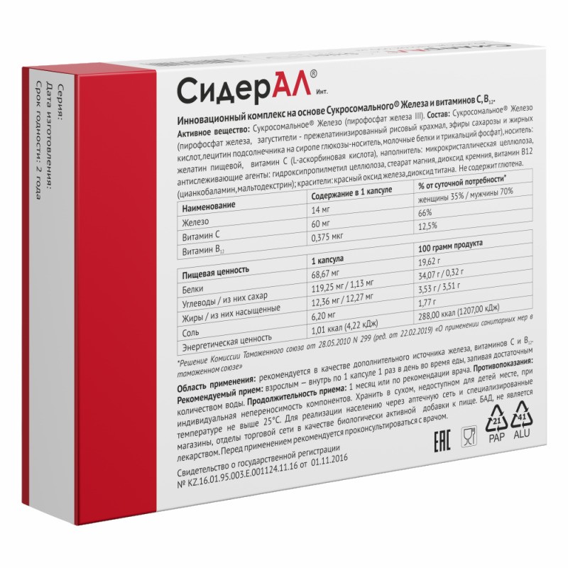 Для реализации населению через аптечную сеть, специализированные магазины и отделы торговой сети, рекомендуется в качестве биологически активной добавки к пище. Как инновационный комплекс на основе сукросомального железа и витамина С, В12.Срок годности от даты изготовления